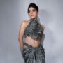 “Alaya’s ensemble is a modern sculptural drape in a gunmetal silver hue, blending the fluidity of a sari silhouette with the edginess of contemporary couture,” shares Jaising. The designer’s concept draws from the idea of liquid metal, “where there’s an interplay of movement, light and texture that feels alive and ever-changing.”