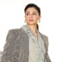 Yesterday, Alia Bhatt followed suit. The actor stepped out in a chiffon sage-green ruffled blouse tucked into high-waisted pants by Alberta Ferretti, layered with an oversized grey blazer from Magda Butrym. She paired the look with white leather pumps from Jimmy Choo and gold earrings and rings from Misho. For her hair and makeup, she opted for her signature dewy pink makeup and pulled-back hair.