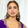 Bhumi Pednekar stepped out in a deep amethyst anarkali by Mrunalini Rao. The curved V-neckline was covered in dense embroidery combining gota-patti and mirror accents, each motif bordered with metallic thread that traced its shape. The embroidery continued along the sleeves, where mirrors were set into geometric floral patterns, and onto the dupatta, where the detailing appeared in smaller placements. Against the jewel-toned fabric, this created a scattered shimmer effect, while scalloped borders finished the edges in a single embroidered line. The skirt fell into a generous flare that ended in a plain hemline, offering contrast to the ornate upper half.