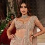 Cut in a sculpted, sweetheart neckline with cap mesh sleeves, the blouse featured shoulder-baring drapes of beaded tassels that doubled as jewellery. Its close fit and cropped length gave a contemporary edge to an otherwise traditionally rooted silhouette. The dupatta, draped casually across one arm, left a sheer trail as Kapoor glided on the ramp.