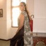 The shimmer of sequins and zardozi announced Neha Dhupia’s arrival before she did, wrapped in an Anamika Khanna sari-inspired gown that turned craft into performance art. A stark black column slit high at the thigh formed the base, overlaid with an embroidered drape that swept across one shoulder and fell like a modern pallu to the floor.