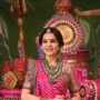 The lehenga unfolded as a patchwork of Banarasi brocades, each panel alive with zari, resham and sequin work. Emerald, scarlet, violet, fuchsia, ivory and gold were stitched into place with gota patti and zardozi borders, their shimmer echoing the temple textiles that inspired them. The choli, cut with elbow-length sleeves, mirrored the embroidery of the lehenga, holding ornament and proportion in balance.