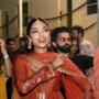 At actor Akhil Akkineni’s wedding festivities in Hyderabad, Sobhita Dhulipala wore a rust orange ensemble that was a contemporary take on the classic anarkali, with flared sharara-style trousers instead of the typical churidar.