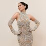 Her look is part of the 2022-23 Haute Couture outing of the Kuwaiti couturier, whose pull extends across continents. His high-embellished gowns and dresses have been graced by the likes of Beyoncé, Lady Gaga and Cardi B on stage and remain a red-carpet staple for the Kardashians, Paris Hilton and several mainstays of pop culture. Al Jasmi has built an empire on his prowess to engineer shimmer. Think bead work that borders on sculptural, crystals arranged with architectural exactness and silhouettes moulded to the body.